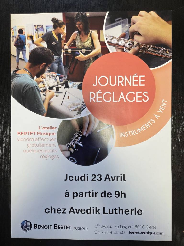 Le jeudi 23 avril 2026, Bertet Musique (Grenoble), luthiers pour les instruments à vent, seront présents à l’atelier. Si vous êtes intéressés par une révision, merci de me contacter ou de les appeler au : 04 76 89 40 40.